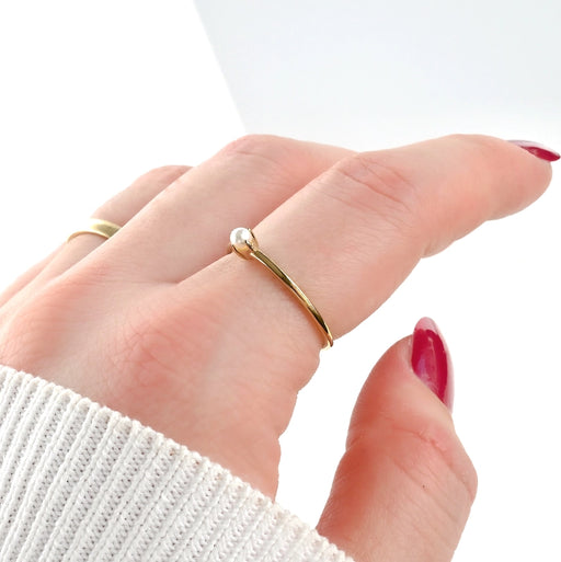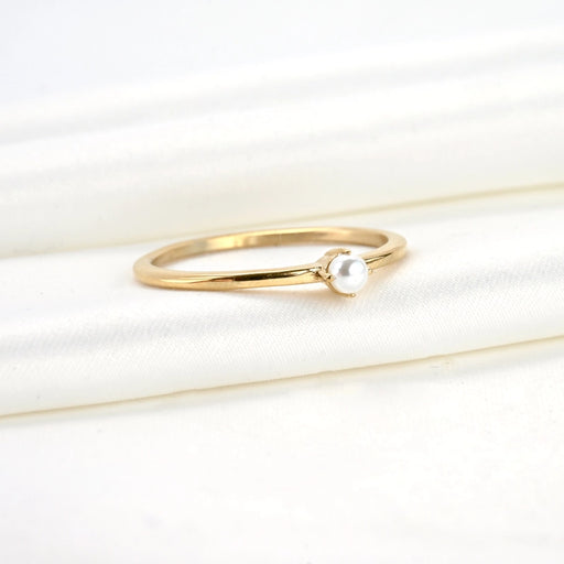 Made in 18k Gold PVD plated stainless steel and set with a single imitation pearl in a prong setting, this sleek waterproof pearl ring is a piece y...