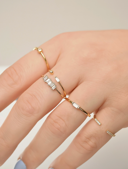 These exquisite rings are all finished in 18k gold. Material: 925 Silver Finish: 18k Gold Styles: Baguette: 5x1.8mm