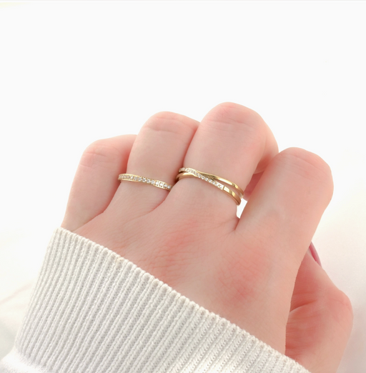 Made in 18k Gold PVD plated stainless steel and set with high-quality Cubic Zirconia stones in a pave setting, this waterproof ring set features a ...