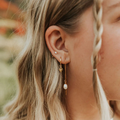 The Crystal Cove Pearl Threaders are this season's must have jewelry. Made of hypoallergenic gold vermeil (gold plated sterling silver), these earr...